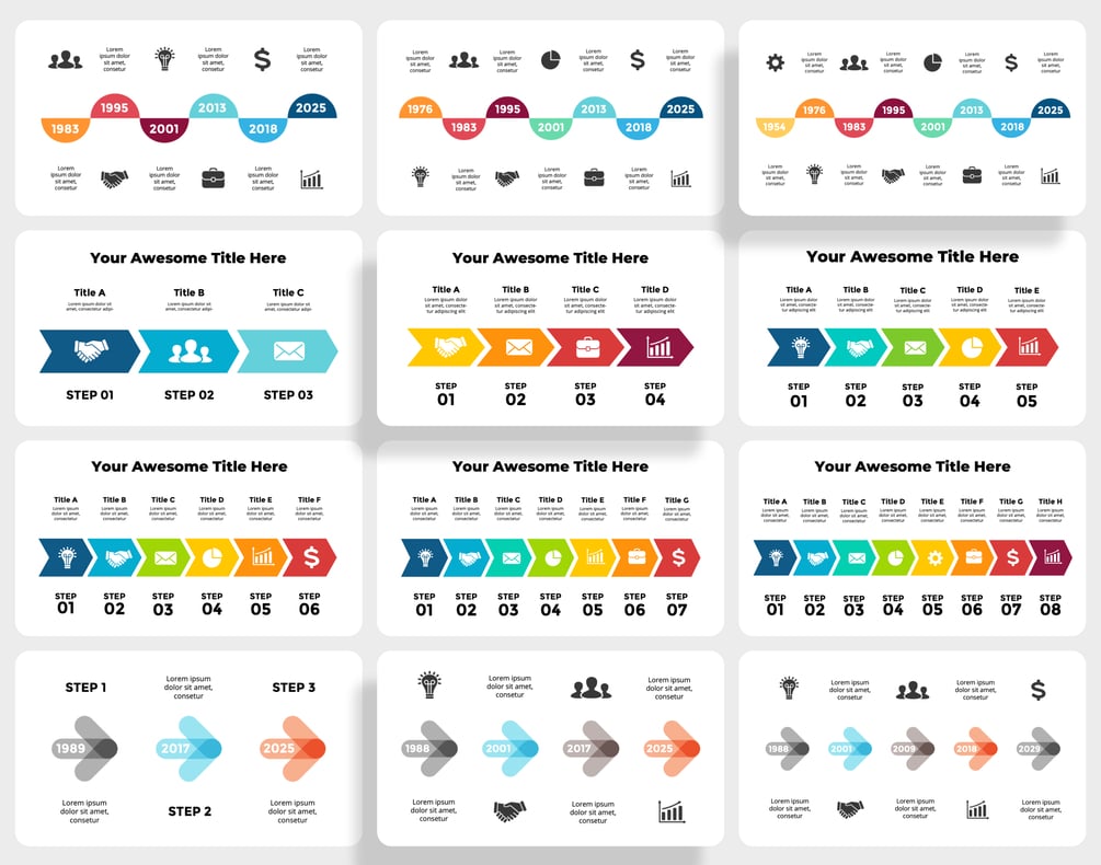 Timelines & Roadmaps Infographics & Presentation Templates, which are included in the 3500+ Wowly Infographics Bundle, available here https://wowlydesign.gumroad.com/l/wowly_3500_presentation_templates_infographics_bundle